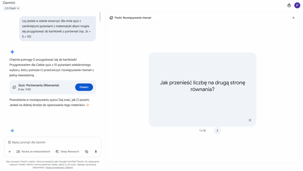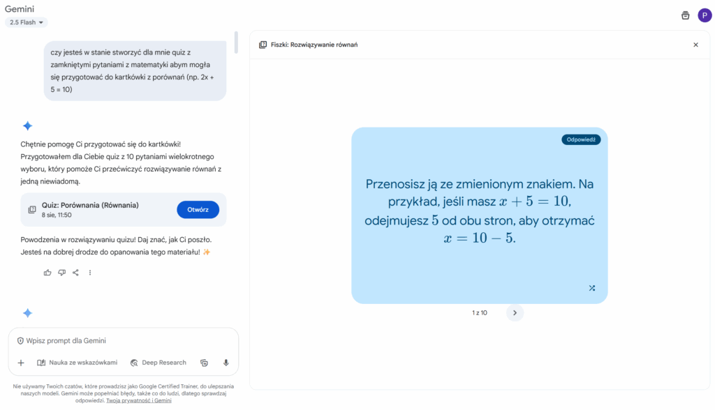 Mając notatki z interesującego Cię tematu, możesz go przesłać do Gemini, a on w trybie nauki na tej podstawie przygotuje Ci zestaw fiszek do powtórki w tym samym czacie. Na przykład:
