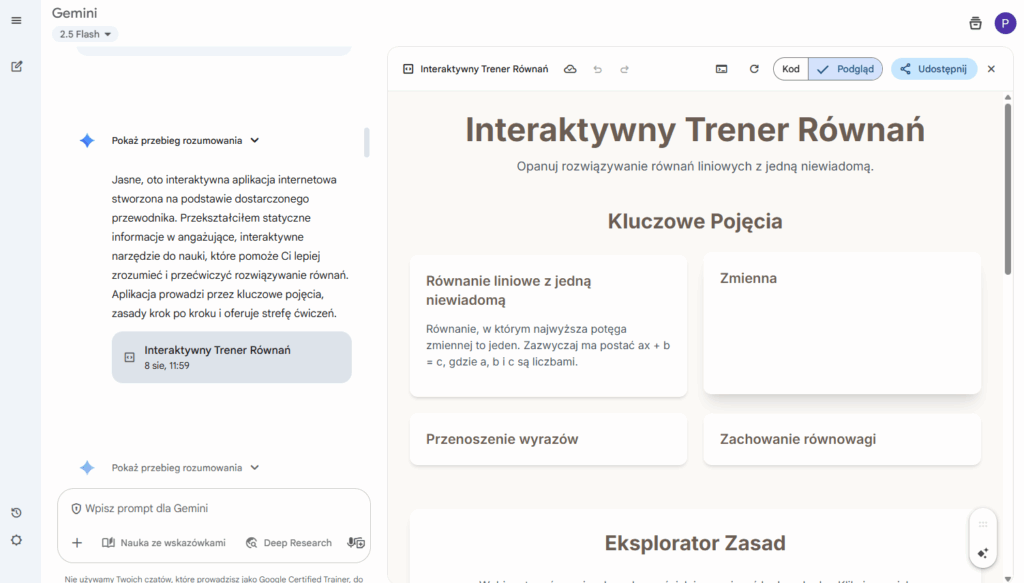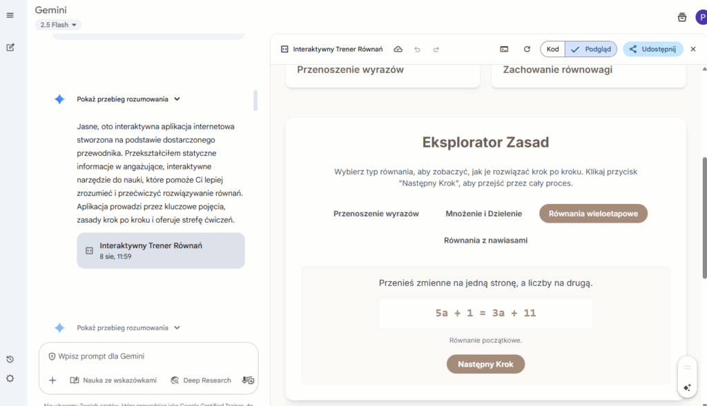Gemini w trybie nauki proponuje wiele interaktywnych rozwiązań, w tym też stworzenie na podstawie informacji zgromadzonej podczas sesji interaktywnych aplikacji internetowych, które można otworzyć w tym samym czacie i używać do ćwiczeń oraz nauki. Na przykład: