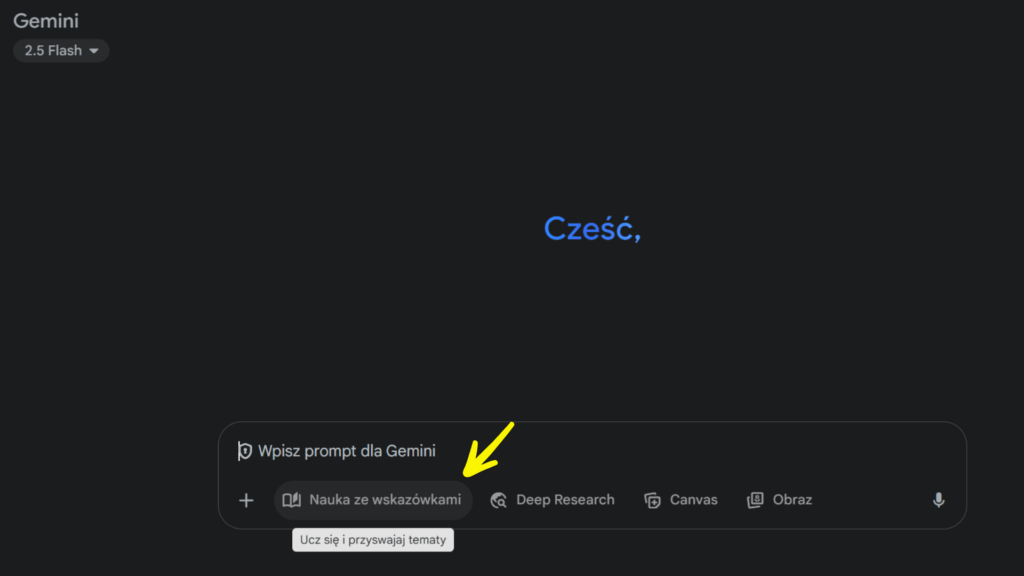 - W polu do wpisywania promptu kliknij przycisk „Nauka ze wskazówkami”.