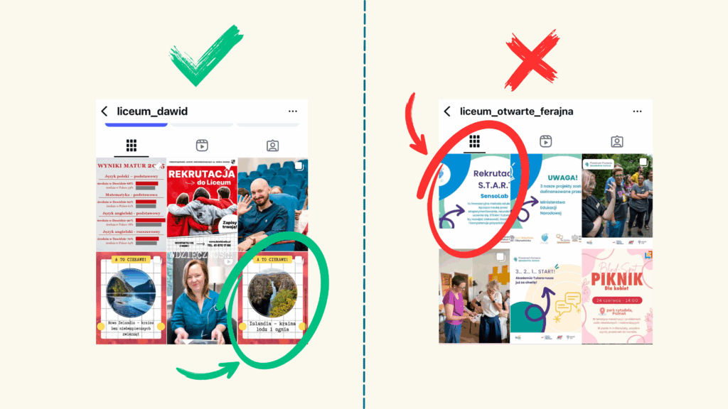 Jak widzisz na przykładzie powyżej, na profilu szkoły po lewej stronie wszystkie posty są czytelne. Z daleka widzimy całość grafiki i możemy rozczytać tekst na niej. Natomiast na przykładzie po prawej stronie widzimy, że treść grafiki nie jest widoczna w całości. Możemy się domyślić, że chodzi o rekrutację, ale nawet to jedno słowo nie jest widoczne do końca. Dzieje się tak, ponieważ osoba odpowiedzialna za tworzenie treści nie uwzględniła bezpiecznego marginesu, co powoduje, że ważne informacje są ucinane w miniaturze.